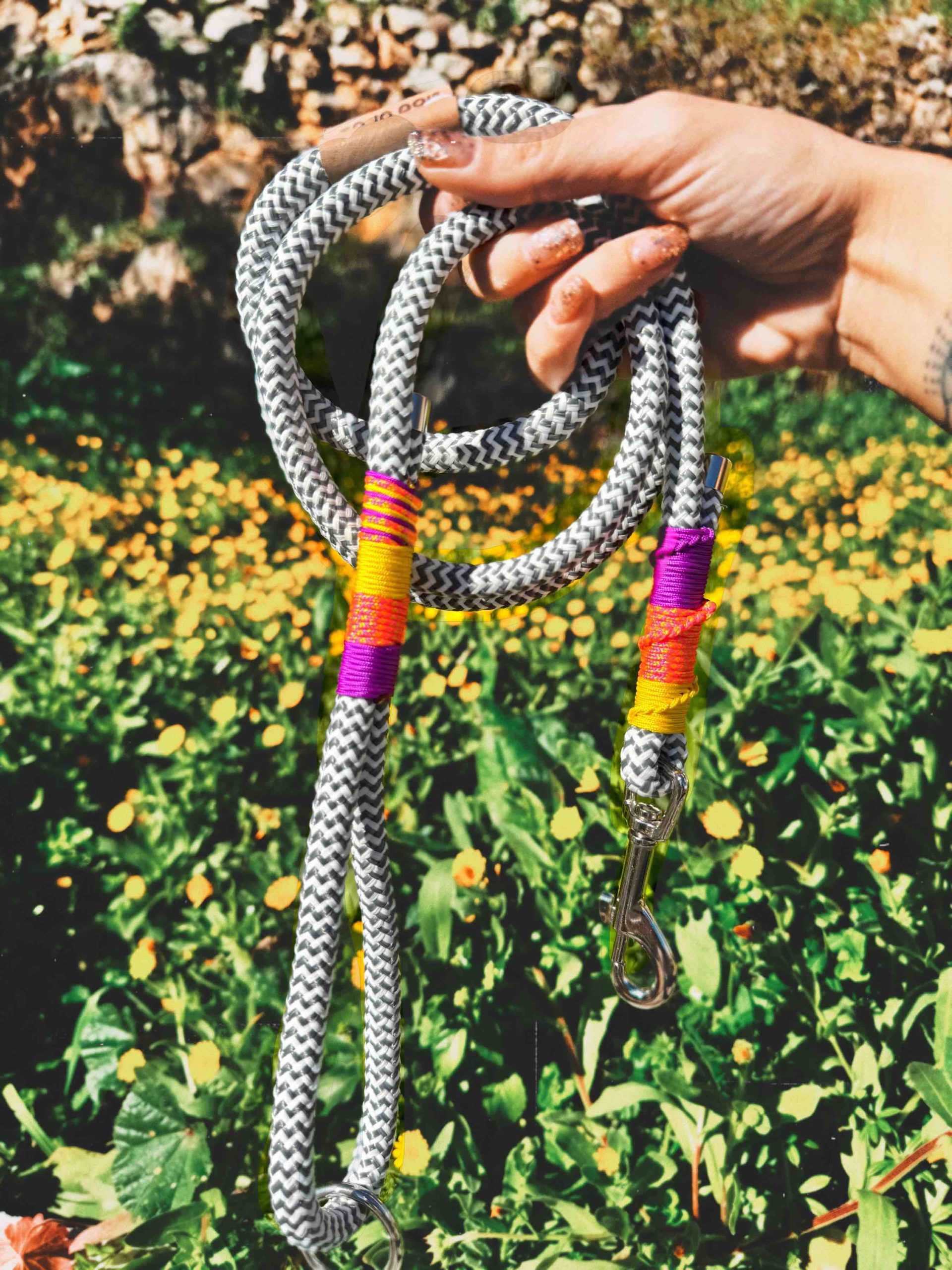 Για να κρατάμε τους φίλους μας κοντά! Με στυλ αλλά και ασφάλεια, η βάση των λουριών είναι από ναυτικό σχοινί (πολυεστέρα), εξαρτήματα από ανοξείδωτο ατσάλι και λεπτομέρειες από κορδόνι αναρρίχησης ( πολυπροπυλενιο)