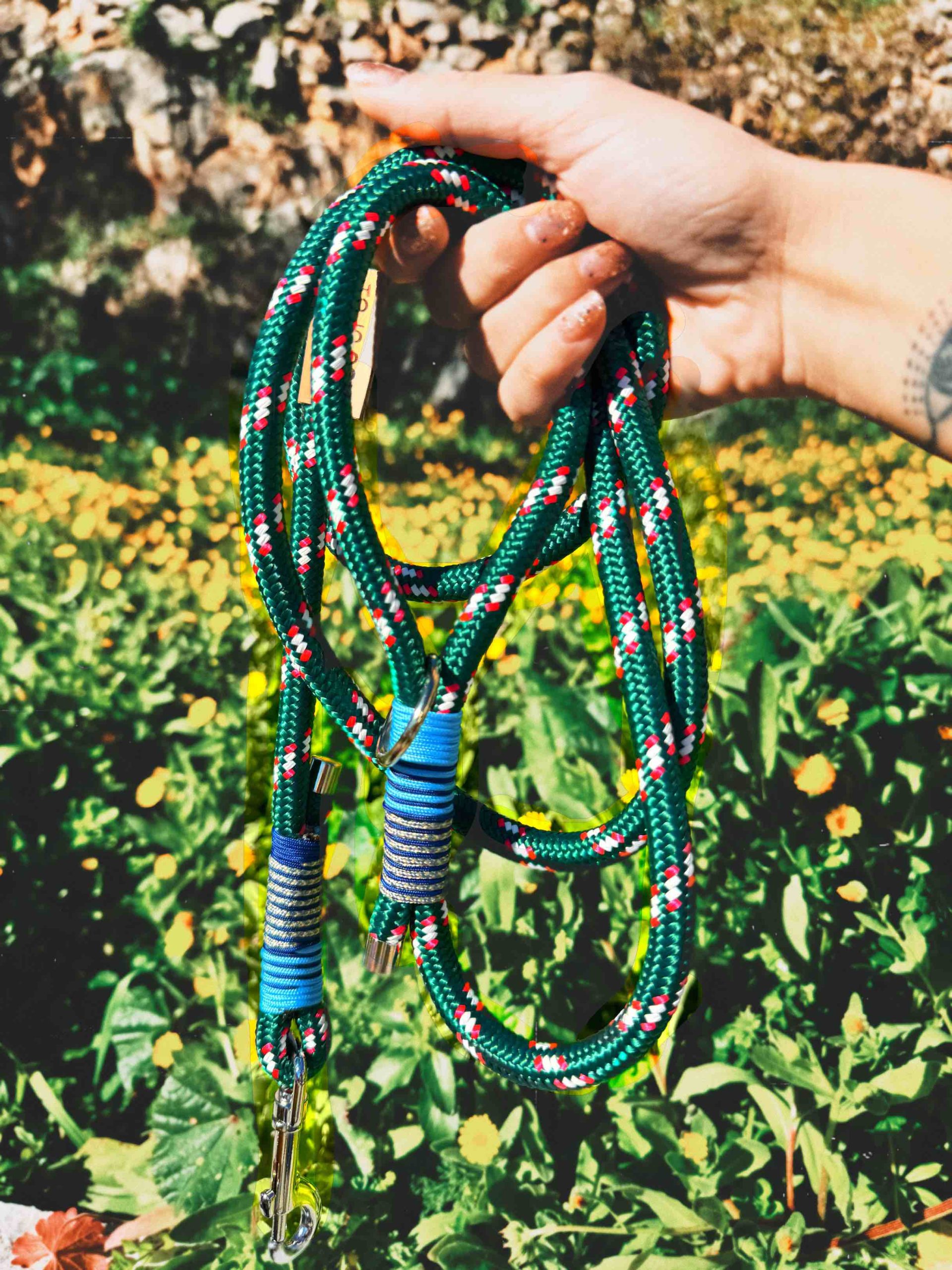 Για να κρατάμε τους φίλους μας κοντά! Με στυλ αλλά και ασφάλεια, η βάση των λουριών είναι από ναυτικό σχοινί (πολυεστέρα), εξαρτήματα από ανοξείδωτο ατσάλι και λεπτομέρειες από κορδόνι αναρρίχησης ( πολυπροπυλενιο)